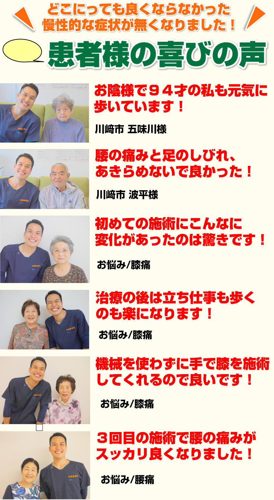 歩楽整骨院では患者様からの『改善の声』『お喜びの声』『お喜びの笑顔』 多くをいただいています。