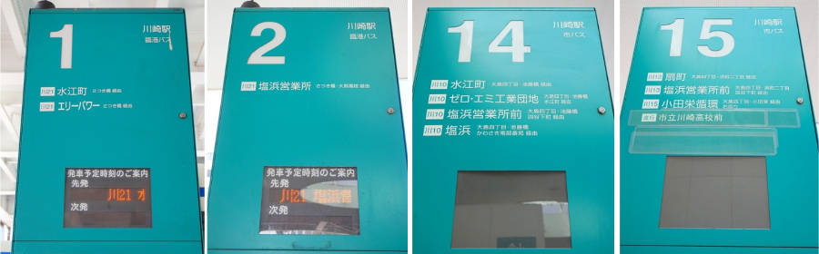 川崎駅東口より臨港バス乗り場1番、2番または市バス乗り場14番、15番のバスに乗車して10分です。